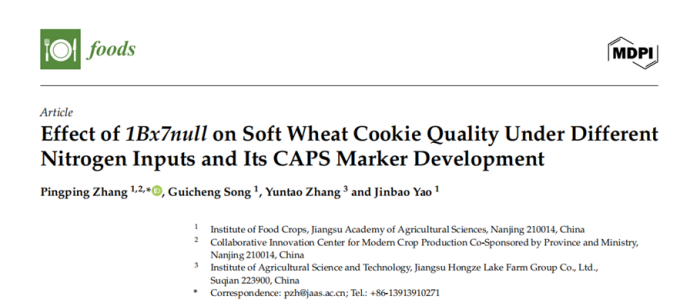 高产是我国小麦生产的刚性需求,而高产与优质协同提升一直是弱筋小麦产业发展的核心矛盾。当前,我国弱筋小麦品种资源普遍存在品质稳定性差、氮肥敏感性高的问题,在常规栽培条件下难以稳定产出符合国家标准的优质原粮,导致弱筋小麦高度依赖进口,其供应短缺已成为我国粮食安全领域的重要挑战。针对这一瓶颈,以加工品质提升为目标,粮作所小麦遗传育种团队致力于弱筋小麦种质资源创新与新品种选育。近日,团队在国际期刊《Foods》(中科院2区,IF5=5.6)发表题为“Effect of 1Bx7null on soft wheat cookie quality under different nitrogen inputs and its CAPS marker development”的研究成果。该研究详细解析了无义突变基因Glu-B1x7null在多环境、不同施氮量条件下对弱筋小麦加工品质的调控效应及其机理,结果显示:该基因在常量施氮与减氮条件下均能显著改善面筋质量;在常规栽培条件下,具有该基因的品系加工品质与野生型相当;针对该基因开发的CAPS标记可用于精准辅助选择育种。该研究成果为弱筋小麦质量协同改良提供了理论依据与技术支撑。